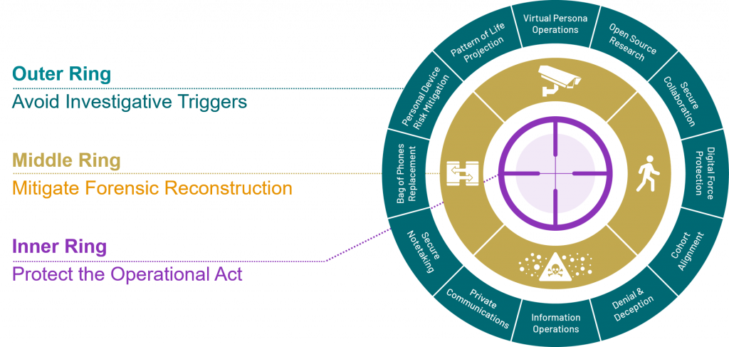 The point of capability isn’t the gear on the table; it’s the effect you can deliver in a UTS fight. The disciplines listed below serve as functional building blocks. Used together, they create the outcomes the mission needs over time: avoiding investigative triggers (Outer Ring), protecting the operational act (Inner Ring), and frustrating forensic reconstruction (Middle Ring). Integrated and exercised as a system-of-systems, they let commanders see, shape, control, and deceive what the environment and adversary learn about their force.